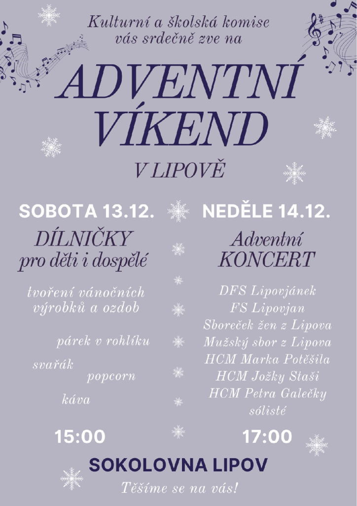 Kulturní a školská komise vás srdečně zve na Adventní víkend v Lipově. V sobotu 13.12. pro vás budou od 15 hodin připraveny Dílničky pro děti i dospělé a v neděli 14.12. vás zveme na Adventní koncert, který začíná v 17 hodin. Přijďte si užít sváteční atmosféru a zapojit se do kreativních aktivit. Těšíme se na vaši účast.