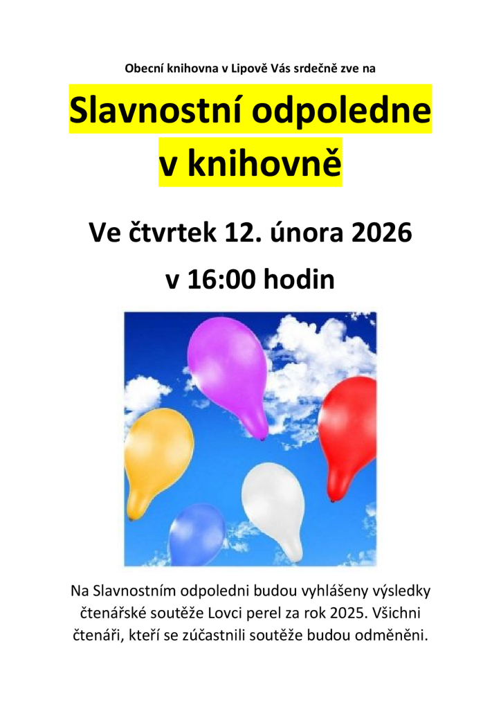 Obecní knihovna v Lipově Vás srdečně zve na slavnostní odpoledne, které se uskuteční ve čtvrtek 12. února 2026 v 16:00 hodin. Během této akce budou vyhlášeny výsledky čtenářské soutěže Lovci perel za rok 2025. Všichni čtenáři, kteří se zúčastnili soutěže, obdrží odměnu.