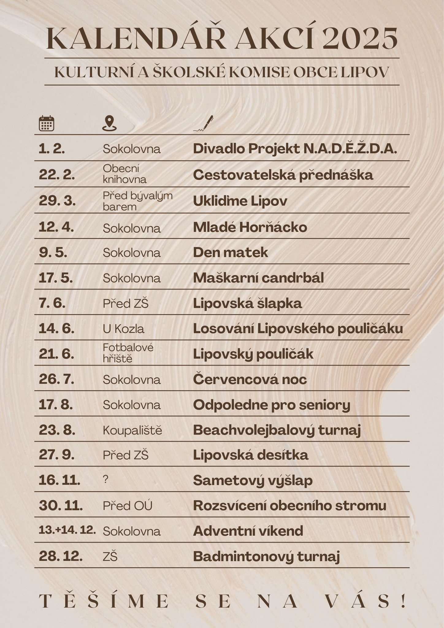 Přehled všech akcí plánovaných Kulturní a školskou komisí obce Lipov na rok 2025.